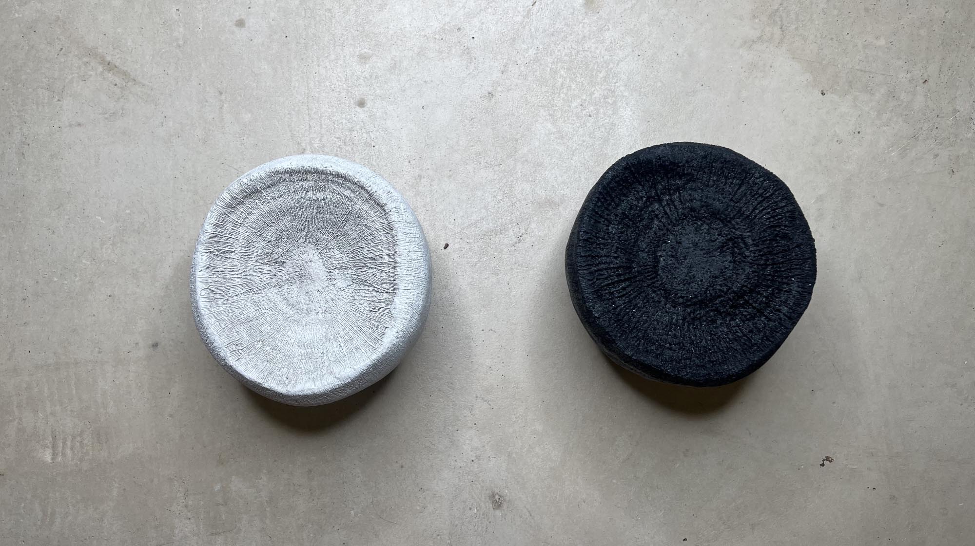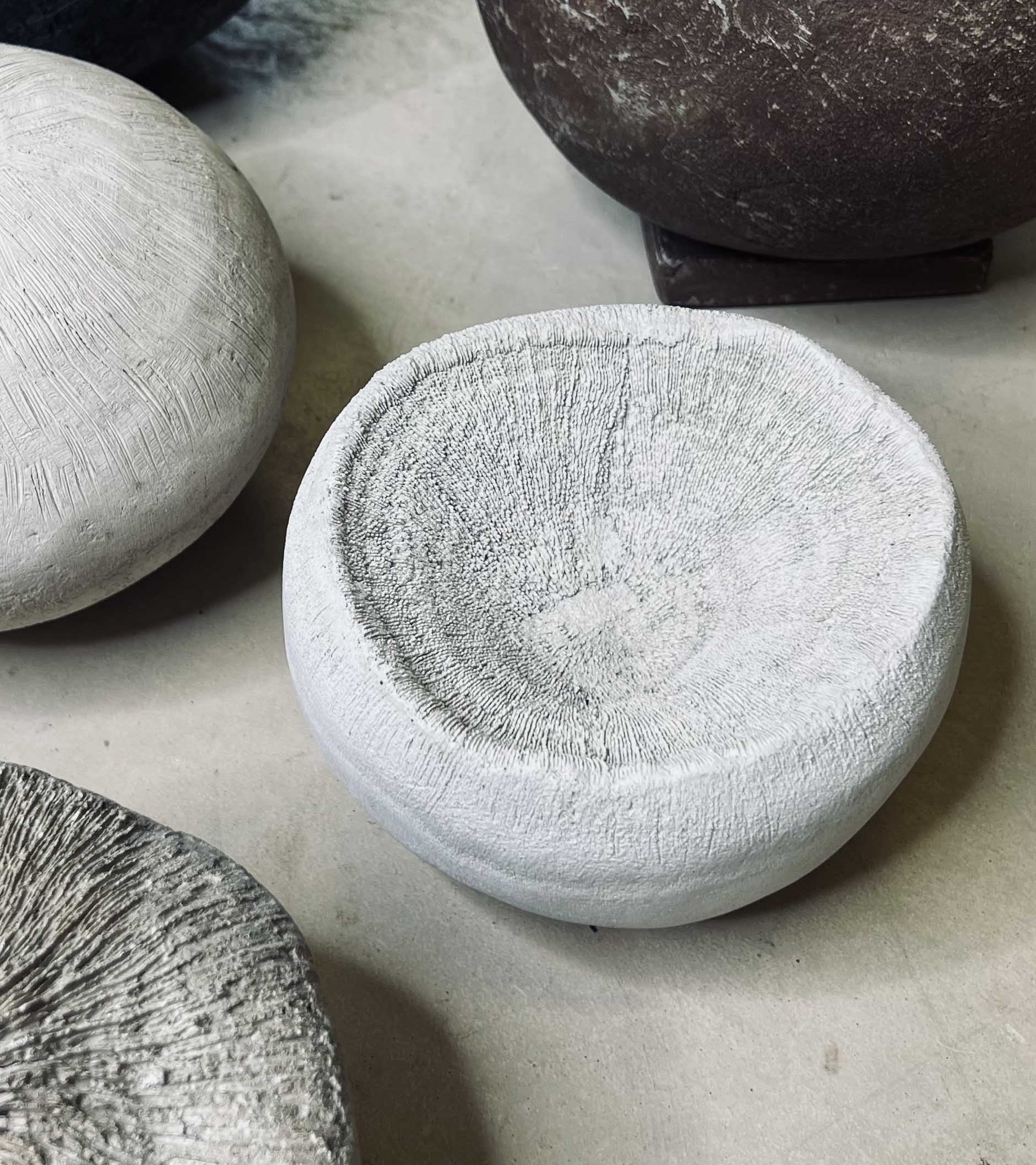 Vaso sfera Omuro con dettagli lisci e ruvidi, in versione pigmenti naturali, effetto vulcanizzato o effetto affumicato, ideale anche per decorazioni, portaoggetti e portavivande. Realizzato in cemento fatto a mano. Adatto per uso interno ed esterno. Ogni pezzo é unico.